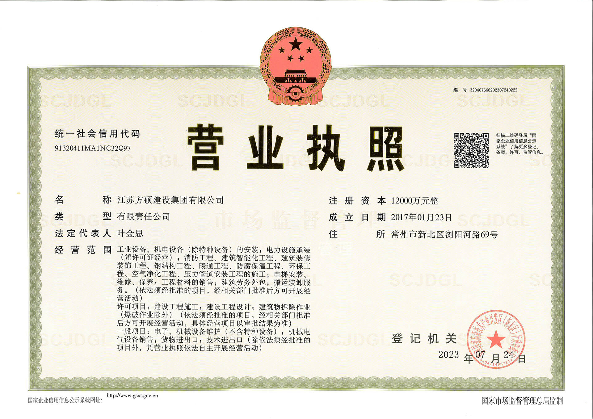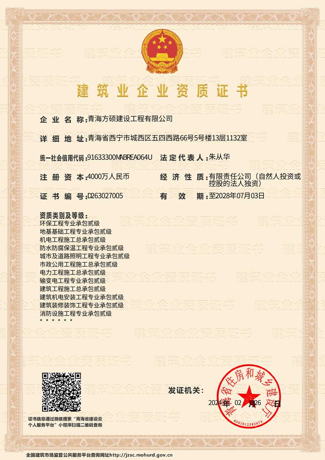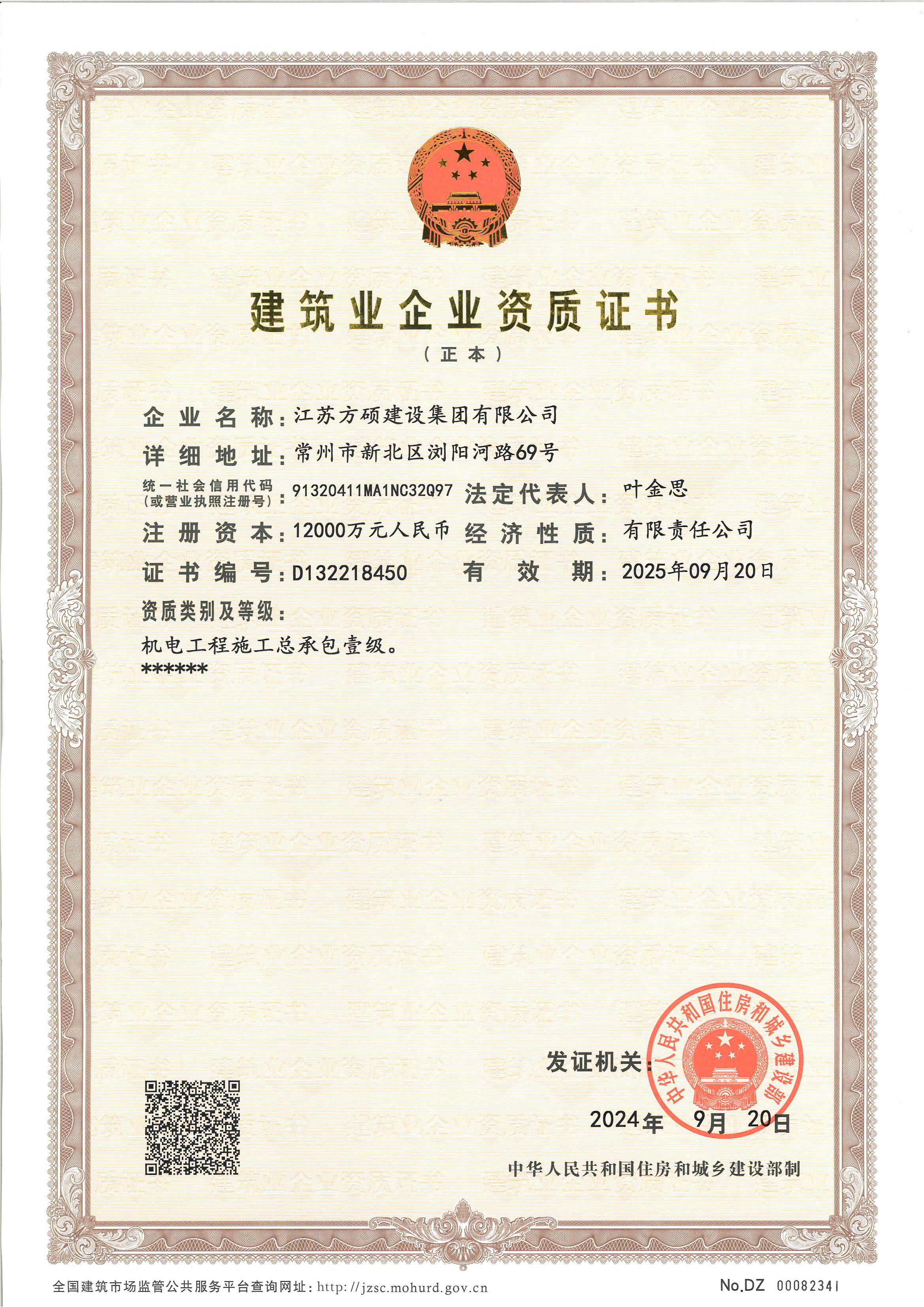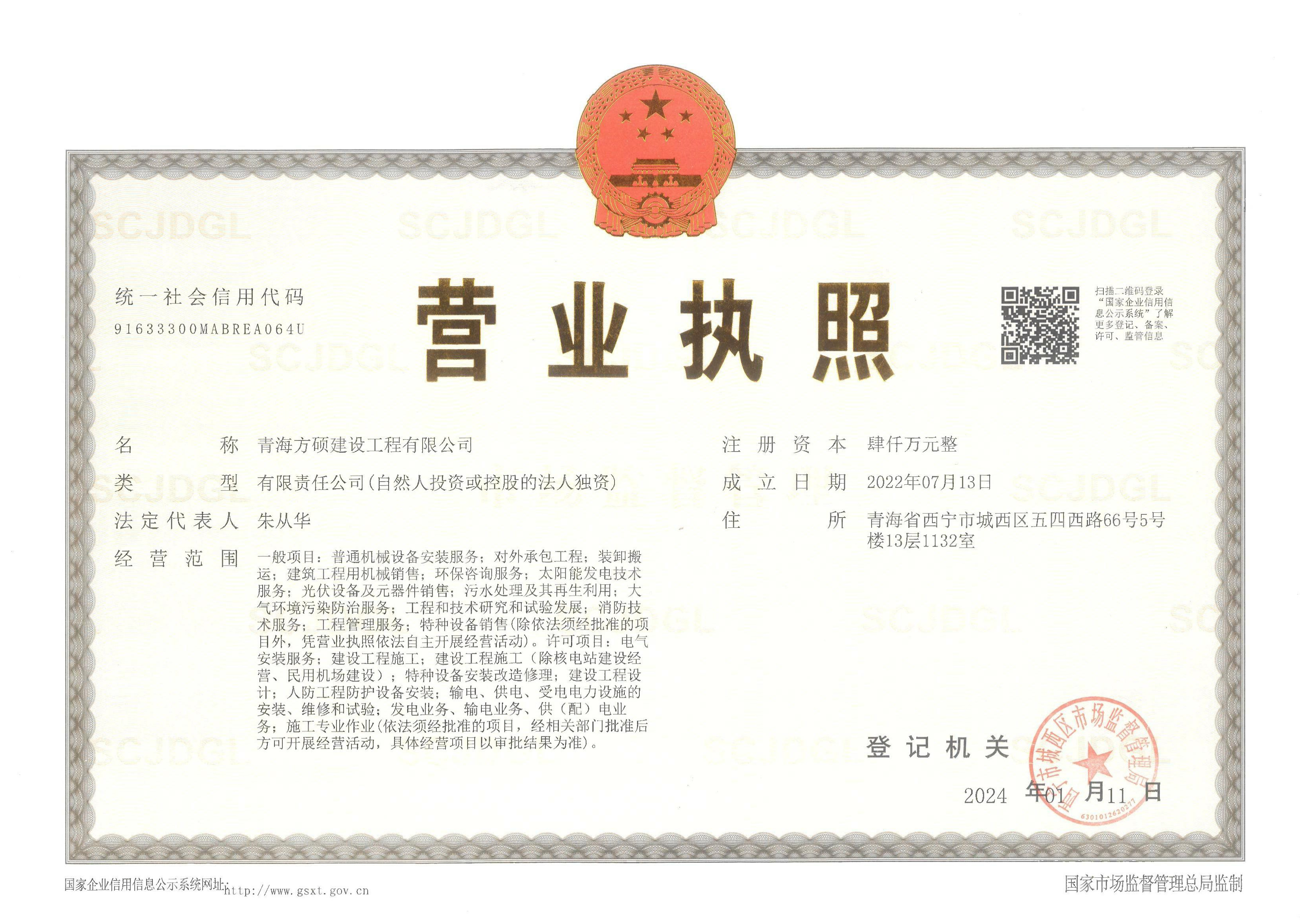 母公司江蘇方碩建設(shè)集團(tuán)有限公司成立于2017年1月,注冊(cè)資本12000萬(wàn)元,坐落于江蘇省常州市新北區(qū)光伏產(chǎn)業(yè)園區(qū)瀏陽(yáng)河路69號(hào);青海方碩建設(shè)工程有限公司成立于2022年7月,注冊(cè)資本4000萬(wàn)元,坐落于青海省西寧市城西區(qū)五四西路66號(hào)5號(hào)樓13層1132室;江蘇方碩電子工程設(shè)計(jì)有限公司成立于2022年3月,注冊(cè)資本1000萬(wàn)元,坐落于江蘇省常州市新北區(qū)高新科技園10號(hào)樓東樓301-2。至2023年底,集團(tuán)總資產(chǎn)已達(dá)12億,已具備建筑工程施工,建筑機(jī)電安裝,建筑裝修裝飾、電力工程施工、新能源電站建設(shè)、儲(chǔ)能電站建設(shè)消防設(shè)施工程、環(huán)保工程、防水防腐保溫工程、地基基礎(chǔ)工程,城市及道路照明工程,市政公用工程,輸變電工程等施工資質(zhì),同時(shí),母公司于2021年通過(guò)了ISO9001:2015質(zhì)量管理體系、IS014001:2015環(huán)境管理體系、IS045001:2018職業(yè)健康安全管理體系的認(rèn)證。
