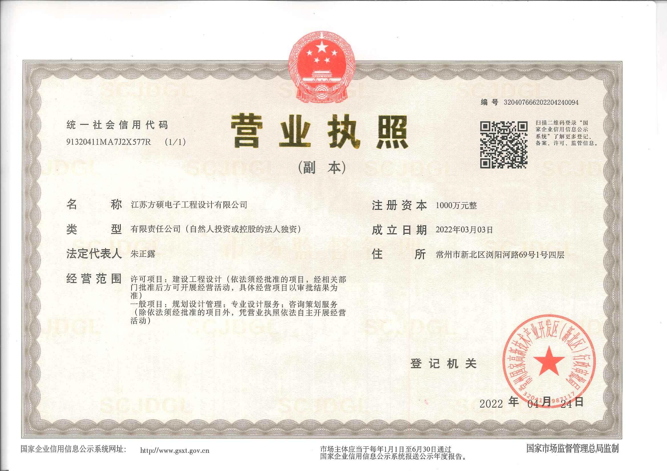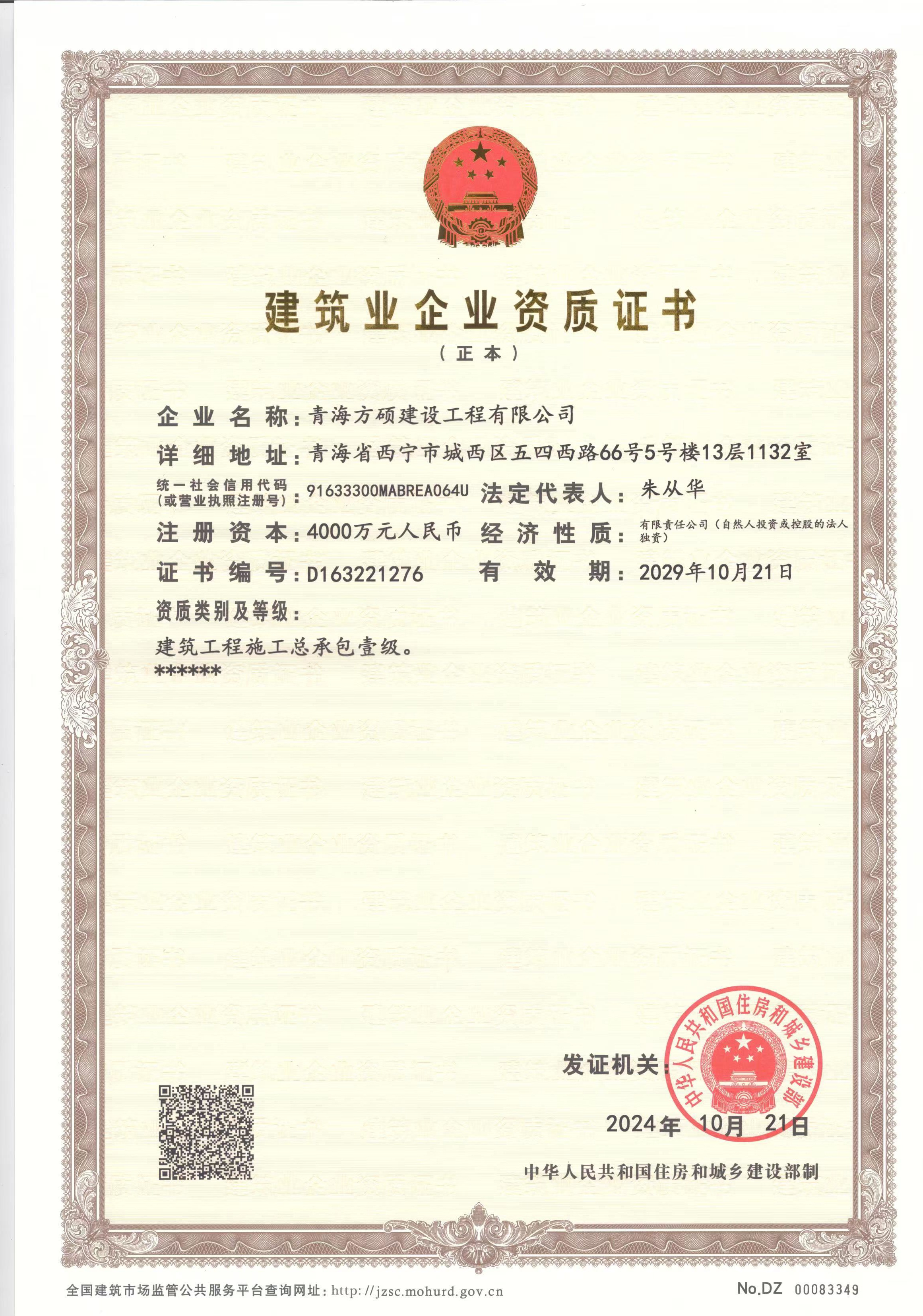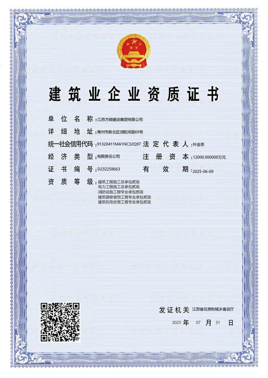 母公司江蘇方碩建設(shè)集團(tuán)有限公司成立于2017年1月,注冊(cè)資本12000萬(wàn)元,坐落于江蘇省常州市新北區(qū)光伏產(chǎn)業(yè)園區(qū)瀏陽(yáng)河路69號(hào);青海方碩建設(shè)工程有限公司成立于2022年7月,注冊(cè)資本4000萬(wàn)元,坐落于青海省西寧市城西區(qū)五四西路66號(hào)5號(hào)樓13層1132室;江蘇方碩電子工程設(shè)計(jì)有限公司成立于2022年3月,注冊(cè)資本1000萬(wàn)元,坐落于江蘇省常州市新北區(qū)高新科技園10號(hào)樓東樓301-2。至2023年底,集團(tuán)總資產(chǎn)已達(dá)12億,已具備建筑工程施工,建筑機(jī)電安裝,建筑裝修裝飾、電力工程施工、新能源電站建設(shè)、儲(chǔ)能電站建設(shè)消防設(shè)施工程、環(huán)保工程、防水防腐保溫工程、地基基礎(chǔ)工程,城市及道路照明工程,市政公用工程,輸變電工程等施工資質(zhì),同時(shí),母公司于2021年通過(guò)了ISO9001:2015質(zhì)量管理體系、IS014001:2015環(huán)境管理體系、IS045001:2018職業(yè)健康安全管理體系的認(rèn)證。