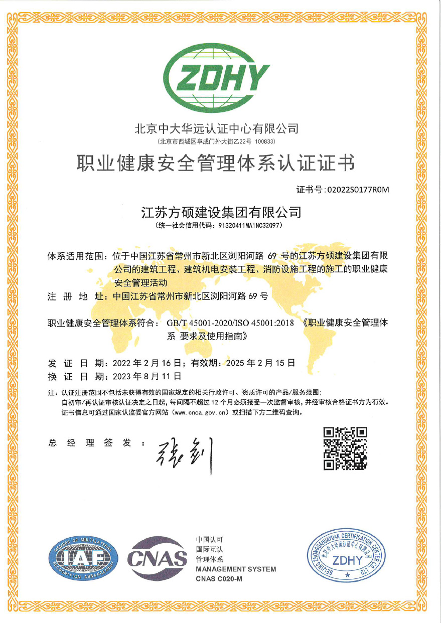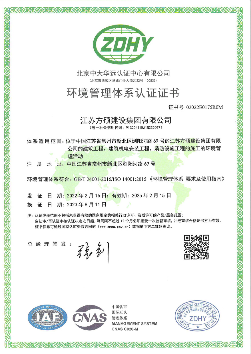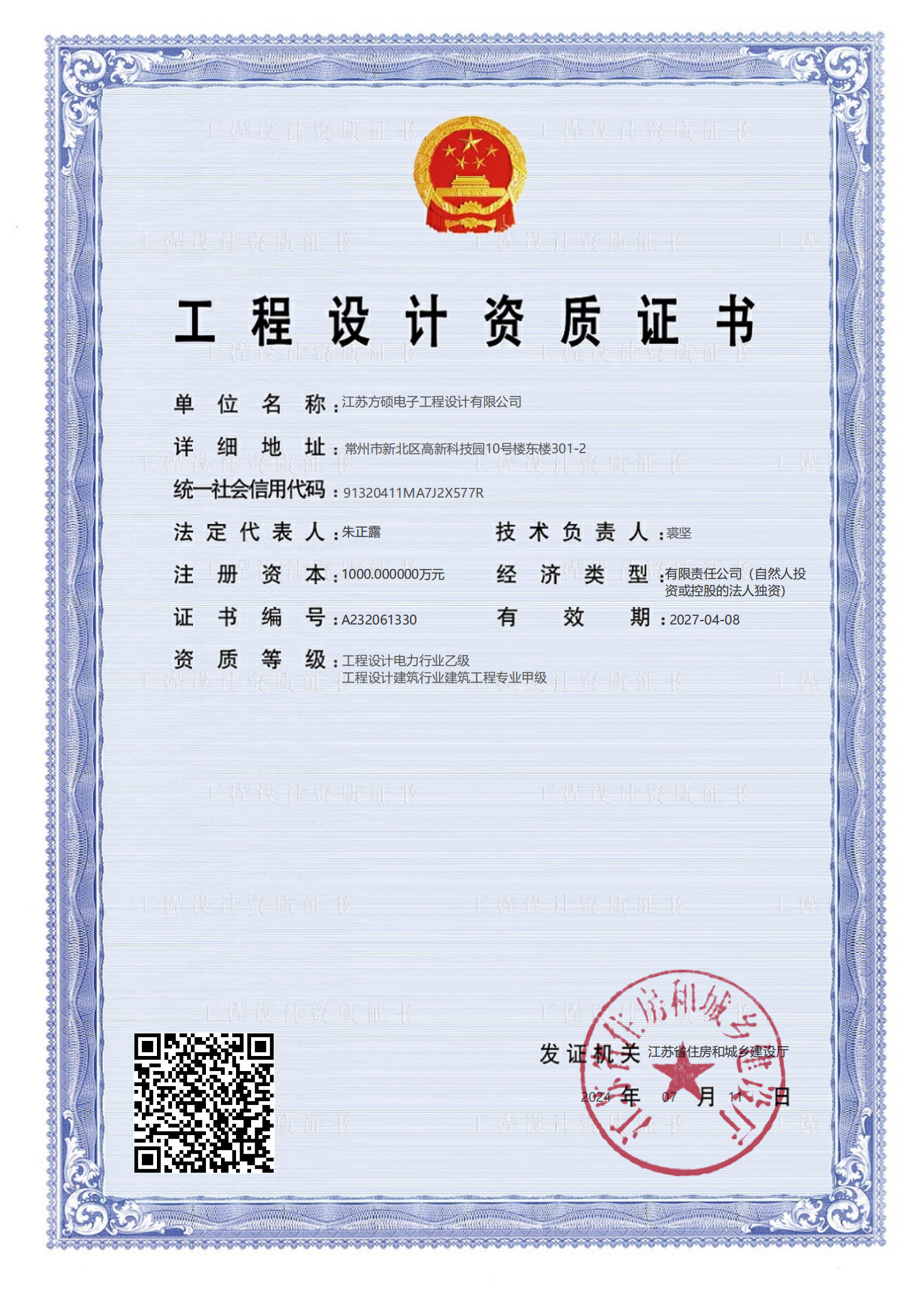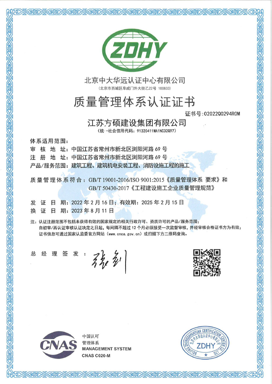 母公司江蘇方碩建設(shè)集團(tuán)有限公司成立于2017年1月,注冊(cè)資本12000萬(wàn)元,坐落于江蘇省常州市新北區(qū)光伏產(chǎn)業(yè)園區(qū)瀏陽(yáng)河路69號(hào);青海方碩建設(shè)工程有限公司成立于2022年7月,注冊(cè)資本4000萬(wàn)元,坐落于青海省西寧市城西區(qū)五四西路66號(hào)5號(hào)樓13層1132室;江蘇方碩電子工程設(shè)計(jì)有限公司成立于2022年3月,注冊(cè)資本1000萬(wàn)元,坐落于江蘇省常州市新北區(qū)高新科技園10號(hào)樓東樓301-2。至2023年底,集團(tuán)總資產(chǎn)已達(dá)12億,已具備建筑工程施工,建筑機(jī)電安裝,建筑裝修裝飾、電力工程施工、新能源電站建設(shè)、儲(chǔ)能電站建設(shè)消防設(shè)施工程、環(huán)保工程、防水防腐保溫工程、地基基礎(chǔ)工程,城市及道路照明工程,市政公用工程,輸變電工程等施工資質(zhì),同時(shí),母公司于2021年通過(guò)了ISO9001:2015質(zhì)量管理體系、IS014001:2015環(huán)境管理體系、IS045001:2018職業(yè)健康安全管理體系的認(rèn)證。